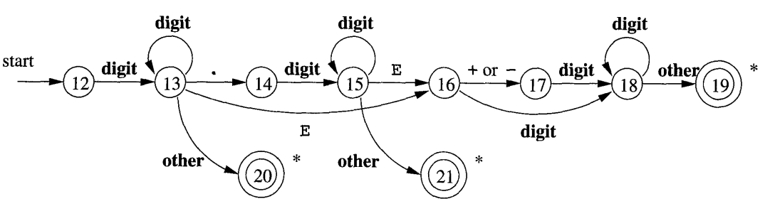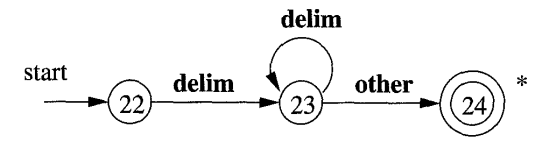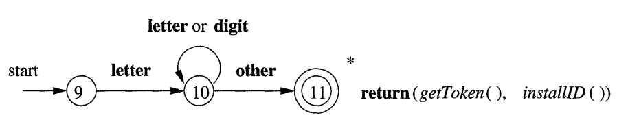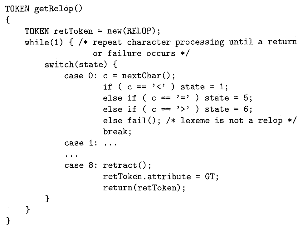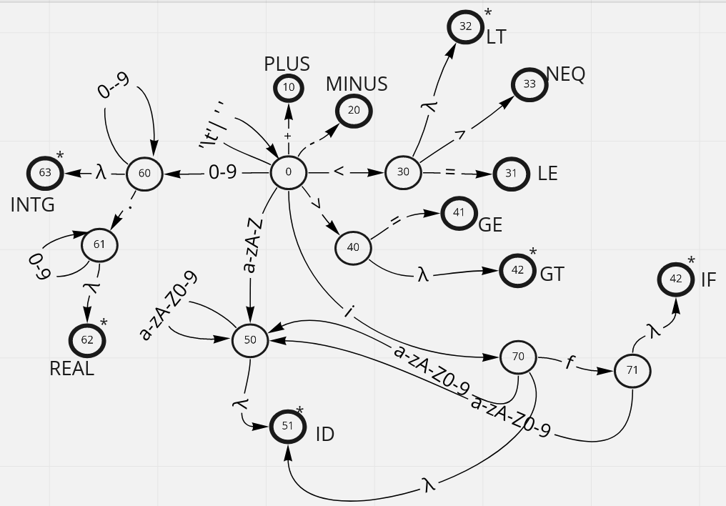 1 #include <iostream> 2 #include <fstream> 3 #include <cstdlib> 4 #include <cstring> 5 #include <cctype> 6 using namespace std; 7 enum Type {IF,WHILE, INT,DOUBLE,RETURN, ID, LT,LE,ASG, END_INPUT}; 8 struct Token{Type t; char *str=nullptr; int i=0; int line,pos; 9 void print(void){cout << t << ":\t" << str << ":\t" << i << endl;} 10 }; 11 class symboleTable{ 12 struct stCls{ char name[32]; Type t;}; 13 public: int n = 0; stCls table[2000]; 14 symboleTable(){ 15 table[n].t=IF; strcpy(table[n++].name,"if"); 16 table[n].t=WHILE; strcpy(table[n++].name,"while"); 17 table[n].t=INT; strcpy(table[n++].name,"int"); 18 table[n].t=DOUBLE; strcpy(table[n++].name,"double"); 19 table[n].t=RETURN; strcpy(table[n++].name,"return"); 20 } 21 char* search(char *bf, int begin, int end, Type &t1){ int i,j; 22 for(i=0; i<n; i++){ 23 for(j=0; table[i].name[j] && begin+j <= end; j++) 24 if(bf[begin+j] != table[i].name[j]) break; 25 // cout << "begin+j: " << begin+j << "\t" << end << "\t" << bf[begin+j] << endl; 26 if(!table[i].name[j] && begin+j-1 == end) 27 {t1=table[i].t; return table[i].name; } 28 } 29 for(i=0;begin+i<=end;i++) table[n].name[i]=bf[begin+i]; 30 table[n].name[i]=0; t1=table[n].t=ID; n++; 31 return table[n-1].name; 32 } 33 void print(void){for(int i = 0; i < n; i++) cout << table[i].name << endl;} 34 };
