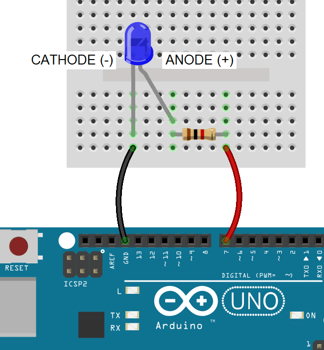#include "SevSeg.h" SevSeg sevseg; void setup(){ byte numDigits = 1; byte digitPins[] = {}; byte segmentPins[] = {6, 5, 2, 3, 4, 7, 8, 9}; bool resistorsOnSegments = true; byte hardwareConfig = COMMON_CATHODE; sevseg.begin(hardwareConfig, numDigits, digitPins, segmentPins, resistorsOnSegments ); sevseg.setBrightness(90); } void loop(){ sevseg.setNumber(4); sevseg.refreshDisplay(); }
