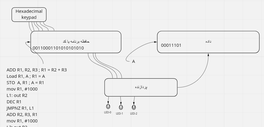 اگر حداکثر ۳۲ دستور داشته باشیم پس پنج بیت برای دستورها نیاز داریم برای سادگی فرض میکنیم که طول همهٔ دستورها یکسان است یعنی هم دو بایت را میگیرند فرض کنید دستورها پنج بیت نیاز دارند پس ۱۱ بیت برای آدرس